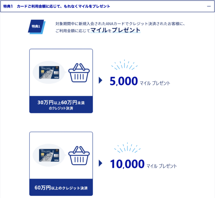 | 積算マイル数 | 30万円以上60万円未満の利用で5,000マイル 60万円以上の利用で10,000マイル |
