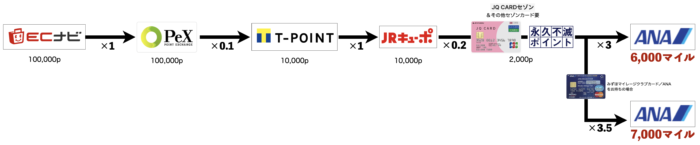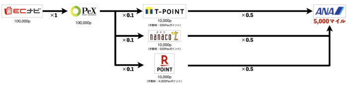 図の通り「Tポイント」「nanacoポイント」「楽天ポイント」を経由するルートです。