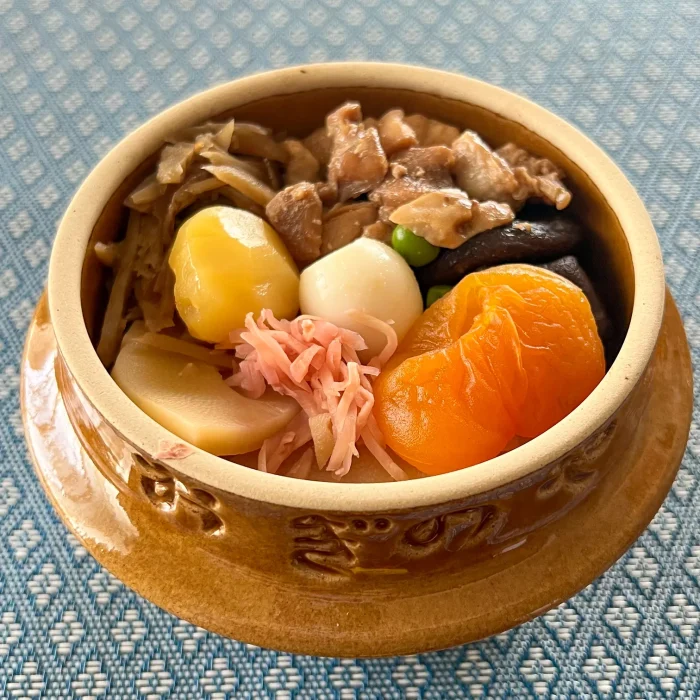 そこにスイーツ代わり的に栗と甘さ控えめの杏が添えられて、具沢山の釜めしになっています。